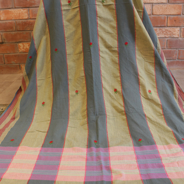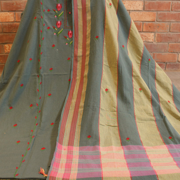 Our signature embroidery features elegant cross-stitch with mirror work, crafted with multicolored threads. The dupatta and sleeves are detailed with eye-catching motifs, while the back is left plain to balance the design. We recommend a loose fit to preserve the fabric’s durability.