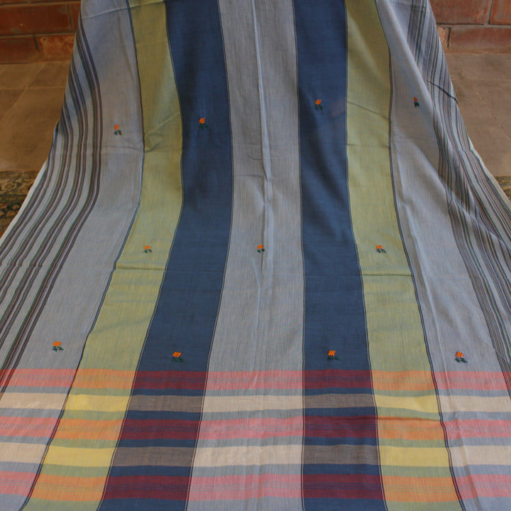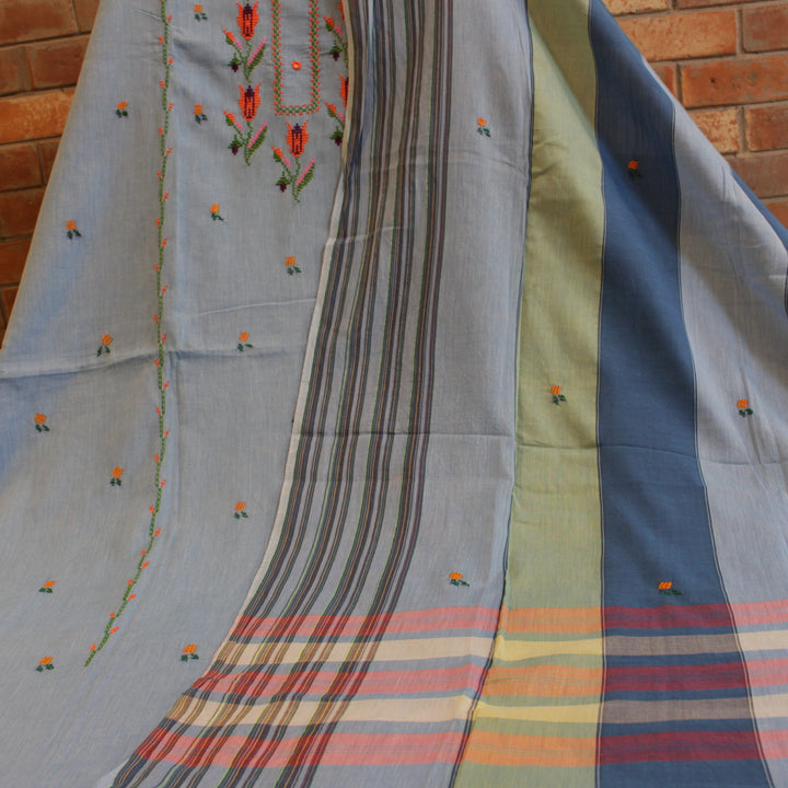 Our signature embroidery features elegant cross-stitch with mirror work, crafted with multicolored threads. The dupatta and sleeves are detailed with eye-catching motifs, while the back is left plain to balance the design. We recommend a loose fit to preserve the fabric’s durability.