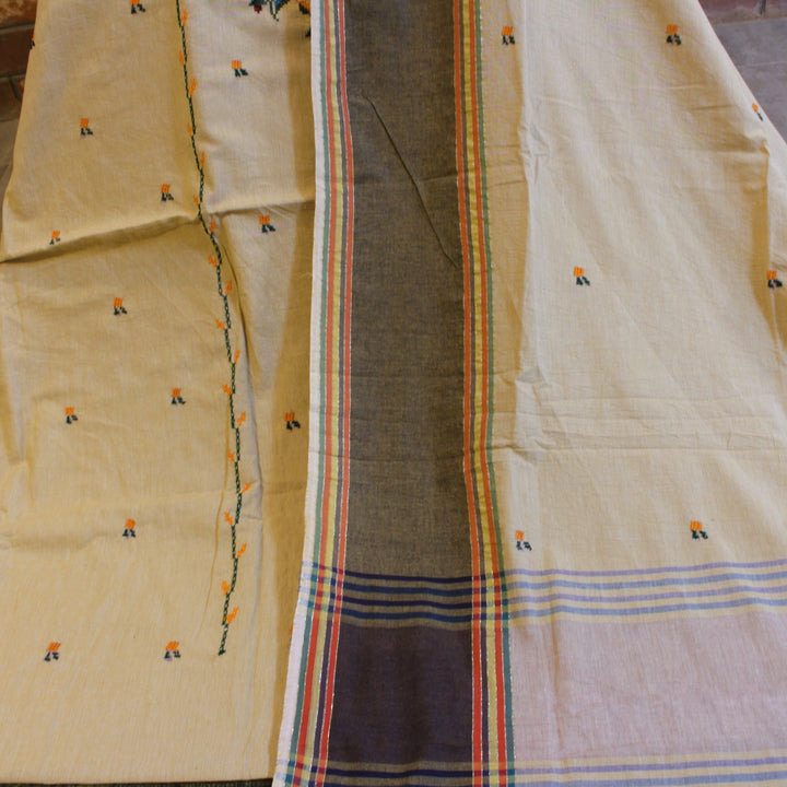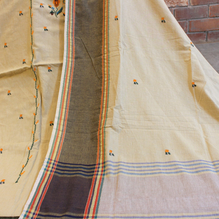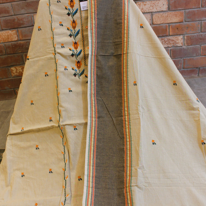 Our signature embroidery features elegant cross-stitch with mirror work, crafted with multicolored threads. The dupatta and sleeves are detailed with eye-catching motifs, while the back is left plain to balance the design. We recommend a loose fit to preserve the fabric’s durability.