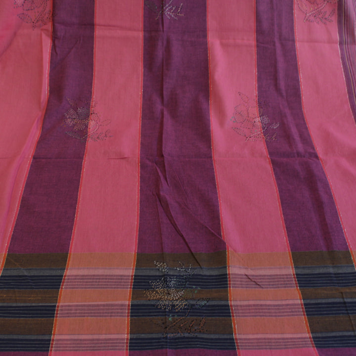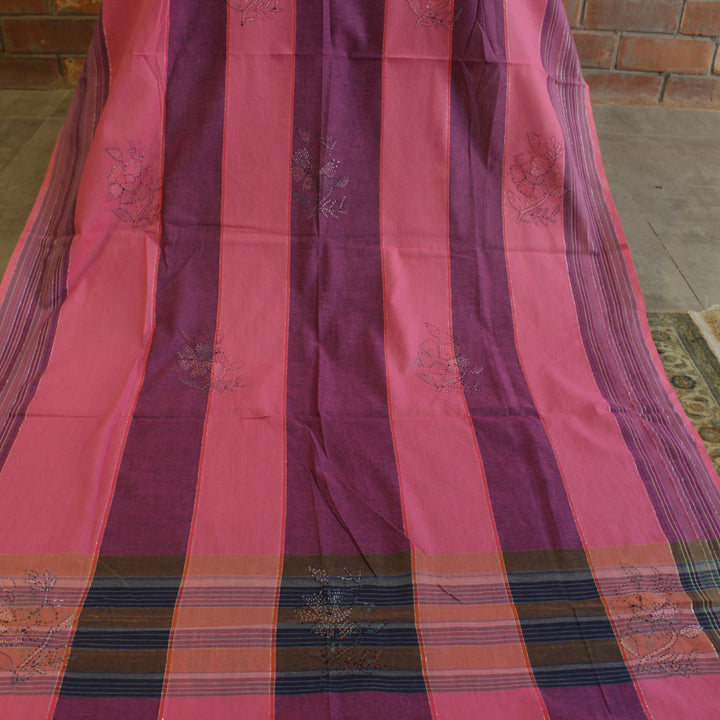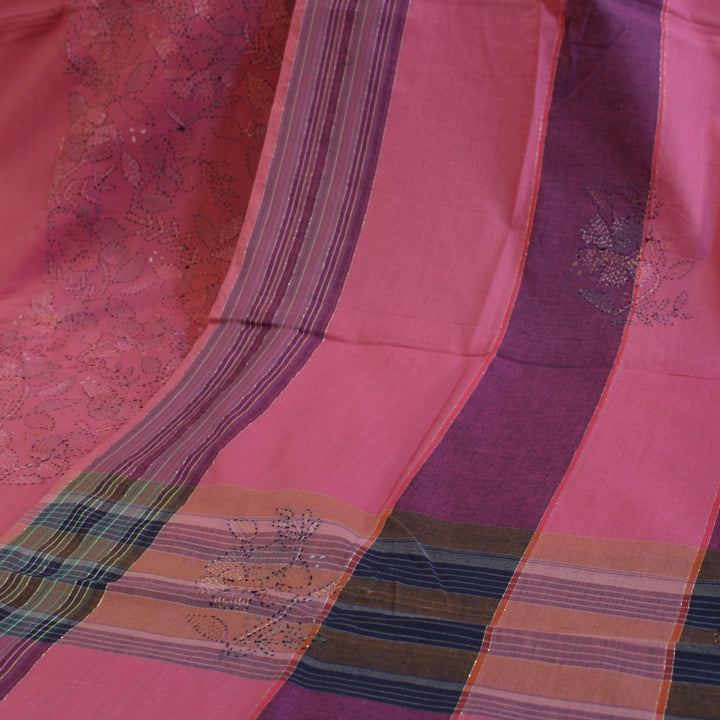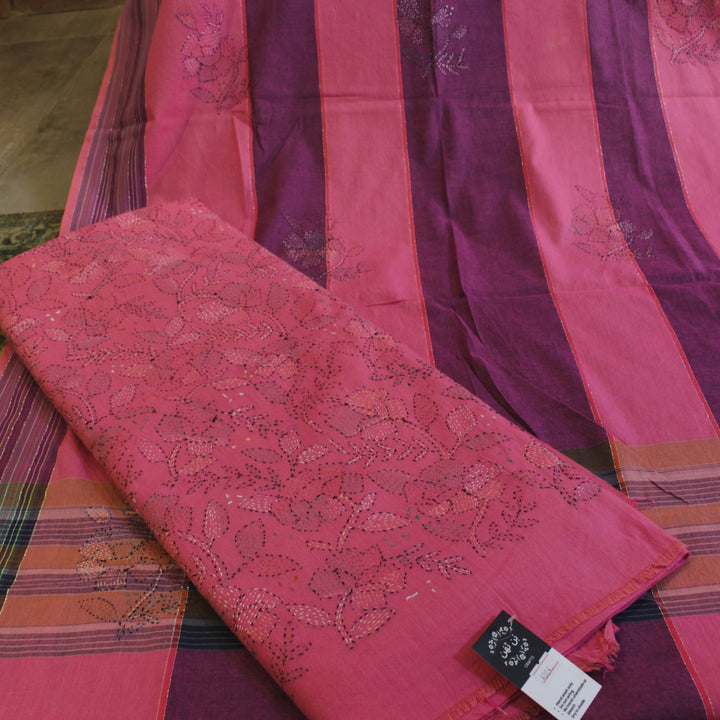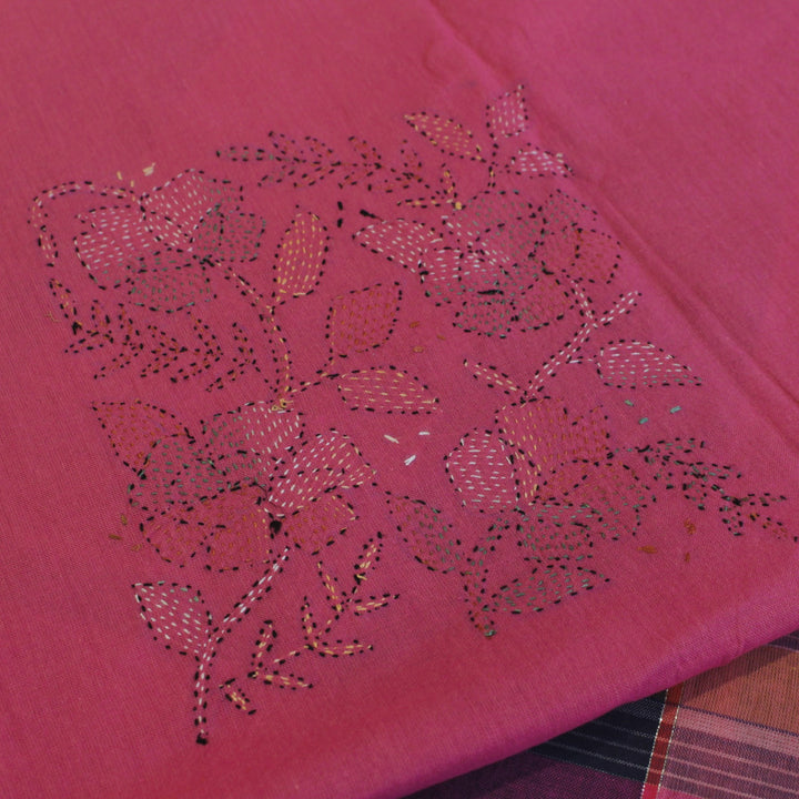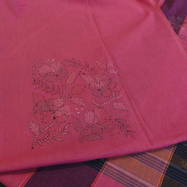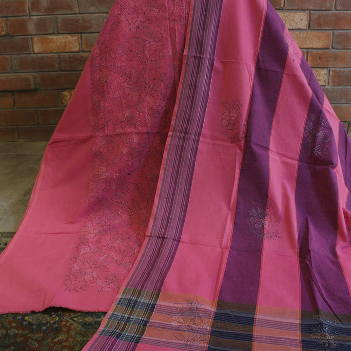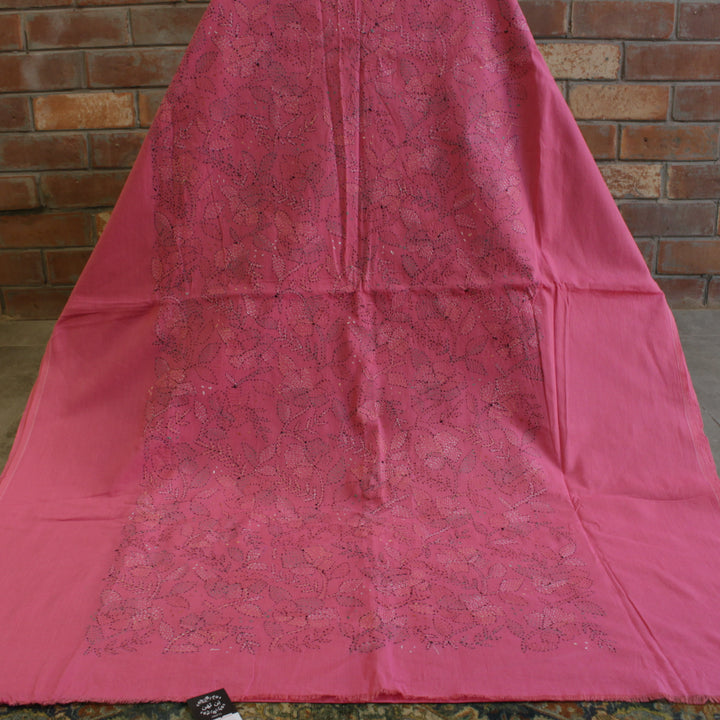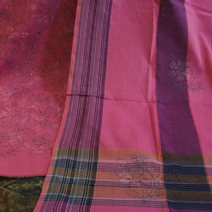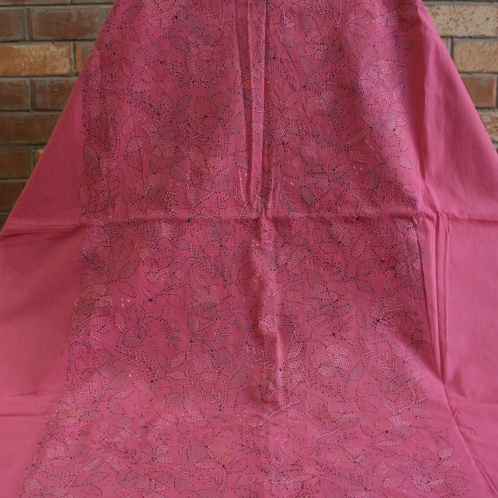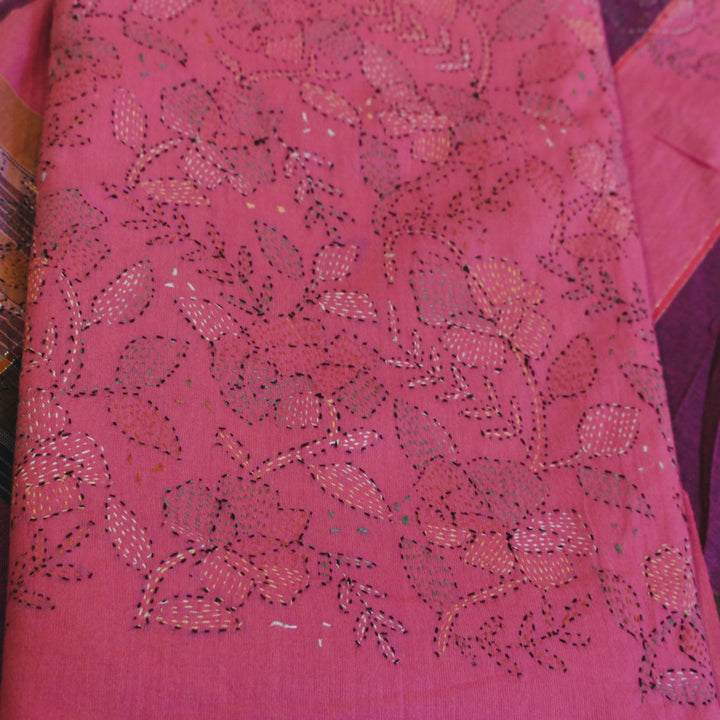 The hand embroidery features intricate kantha-kari detailing with multicolored threads, with the dupatta and sleeves adorned in motifs. The back is kept plain for a balanced look. It is recommended to stitch in a loose fit to prevent fabric rips. The fabric is soft, pure cotton, and should be hand washed with a mild detergent. Slight variations in color and design may occur, making each piece unique.