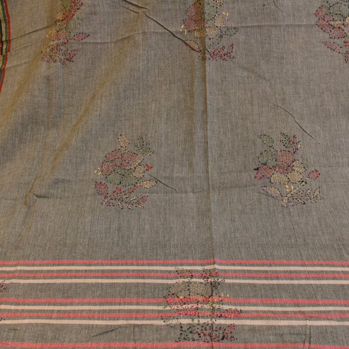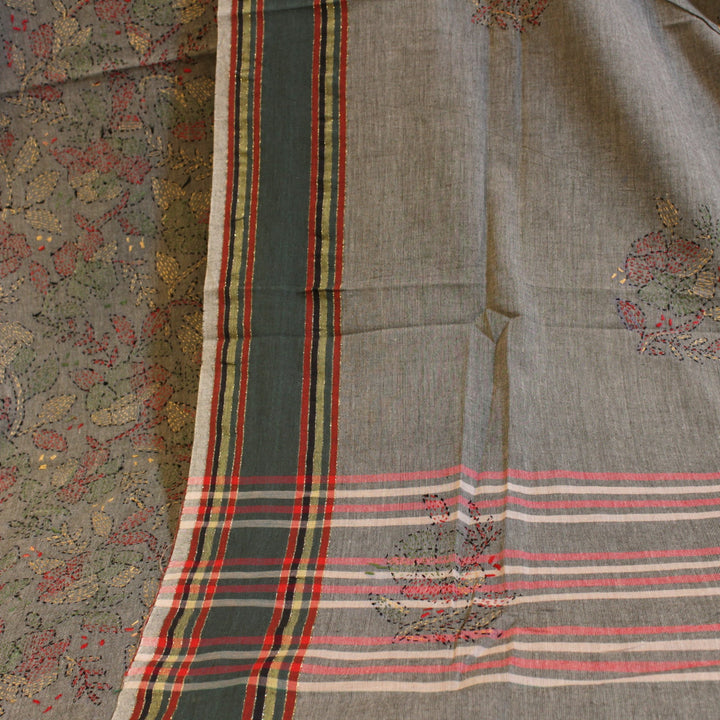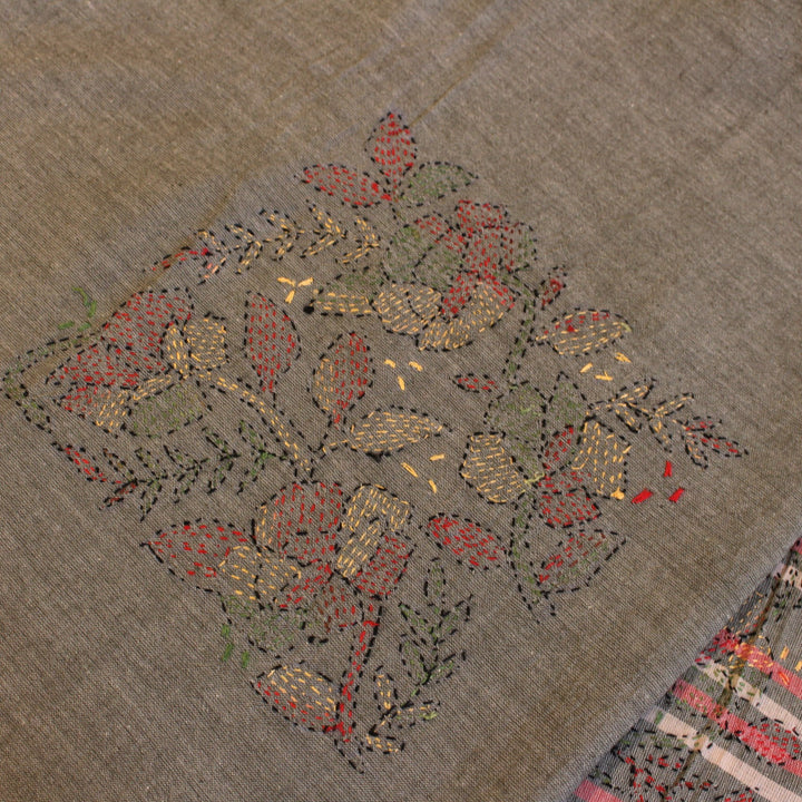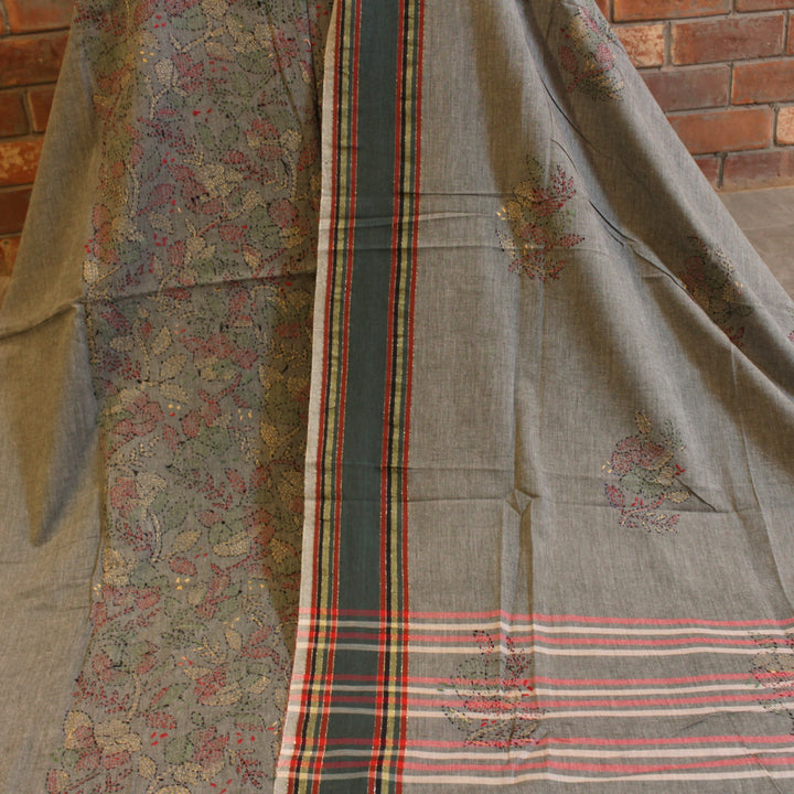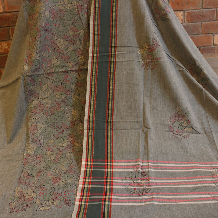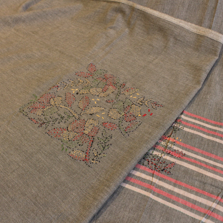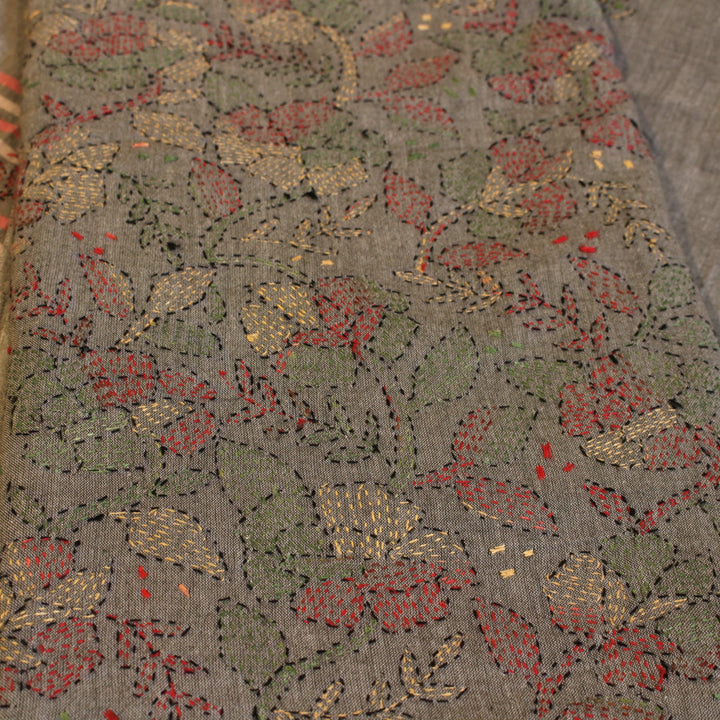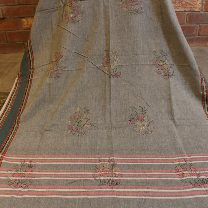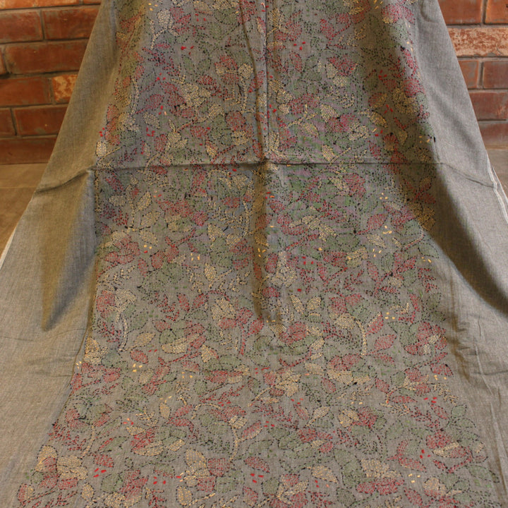The hand embroidery features intricate kantha-kari detailing with multicolored threads, with the dupatta and sleeves adorned in motifs. The back is kept plain for a balanced look. It is recommended to stitch in a loose fit to prevent fabric rips. The fabric is soft, pure cotton, and should be hand washed with a mild detergent. Slight variations in color and design may occur, making each piece unique.