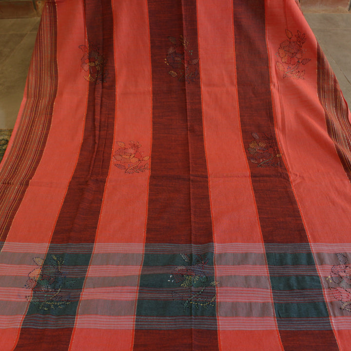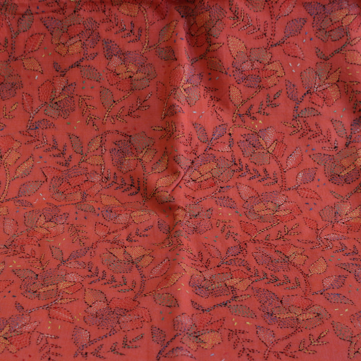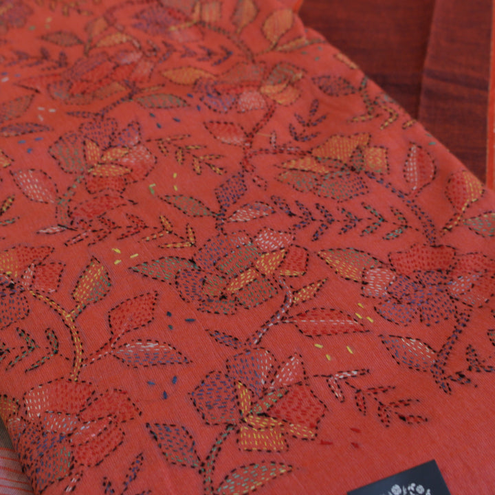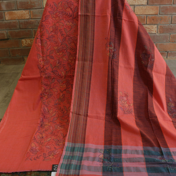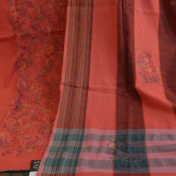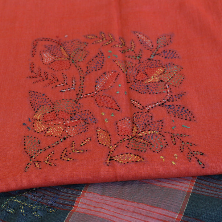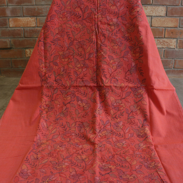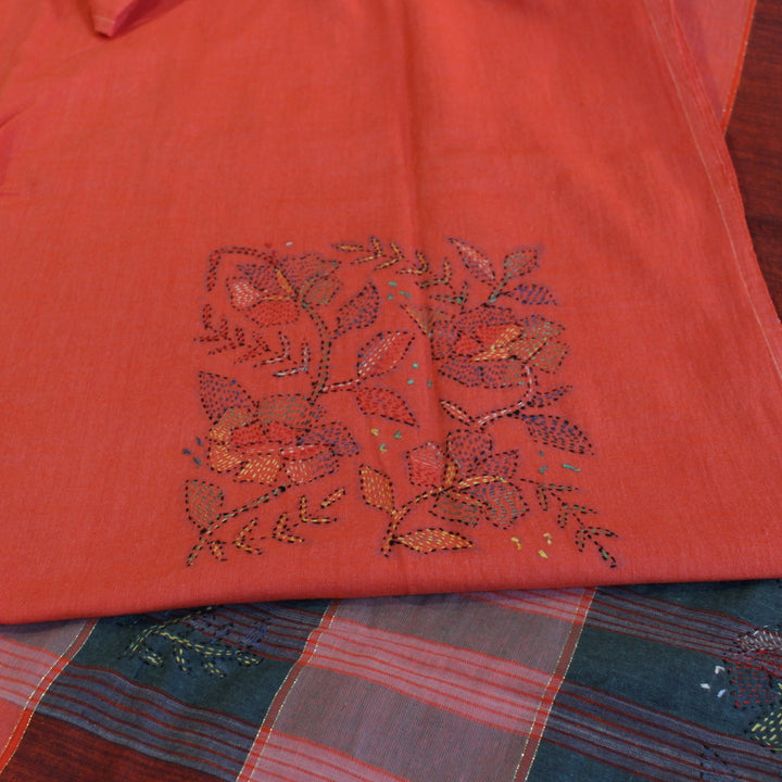 The hand embroidery features intricate kantha-kari detailing with multicolored threads, with the dupatta and sleeves adorned in motifs. The back is kept plain for a balanced look. It is recommended to stitch in a loose fit to prevent fabric rips. The fabric is soft, pure cotton, and should be hand washed with a mild detergent. Slight variations in color and design may occur, making each piece unique.
