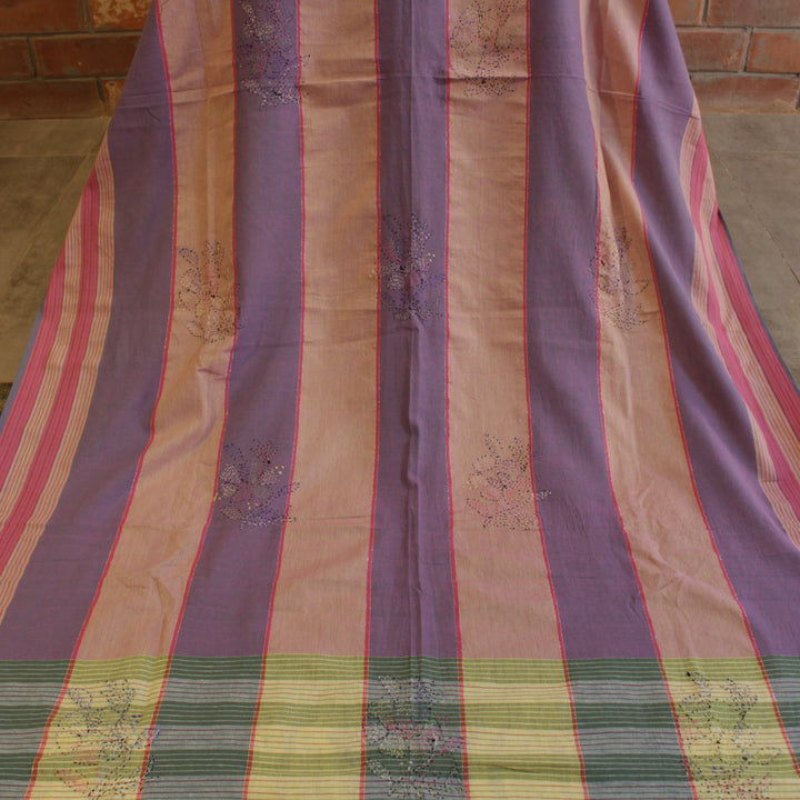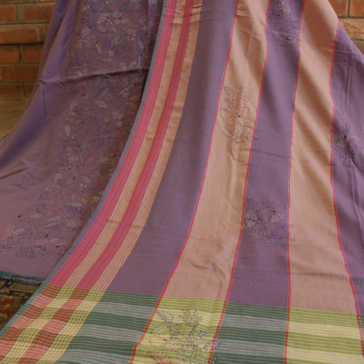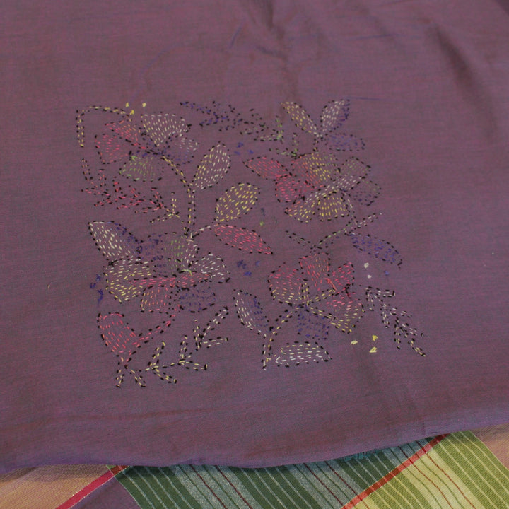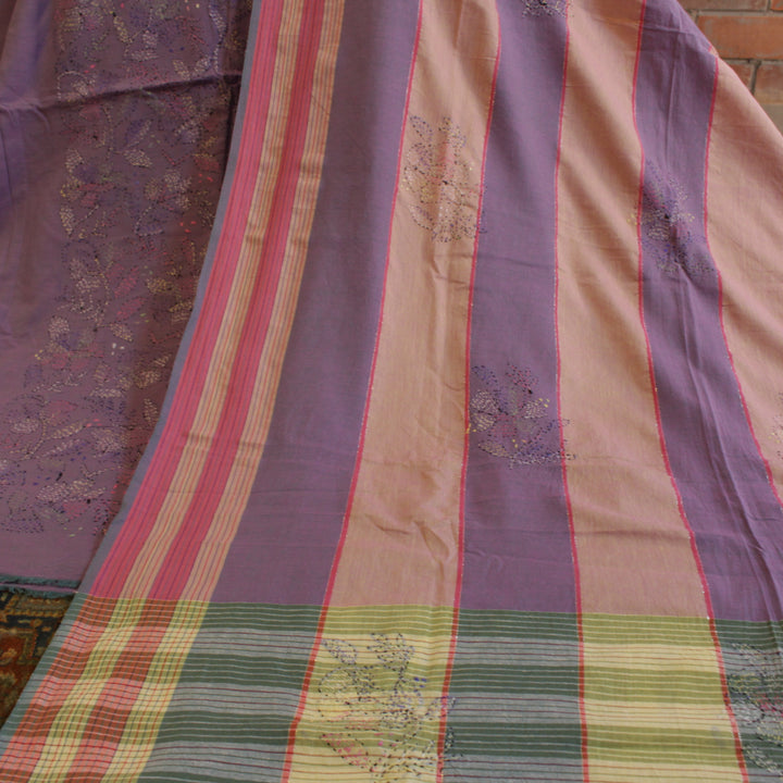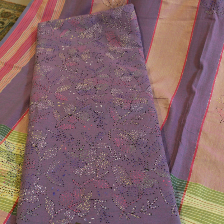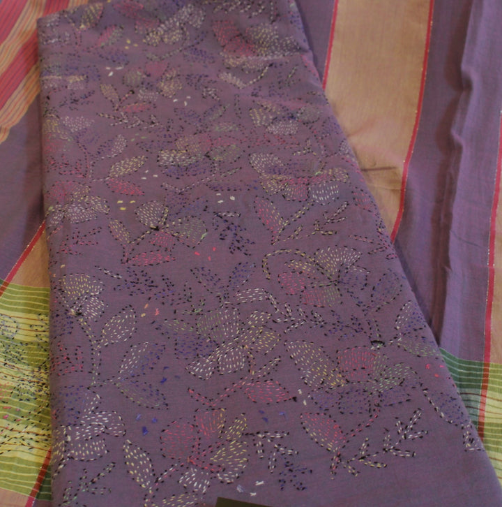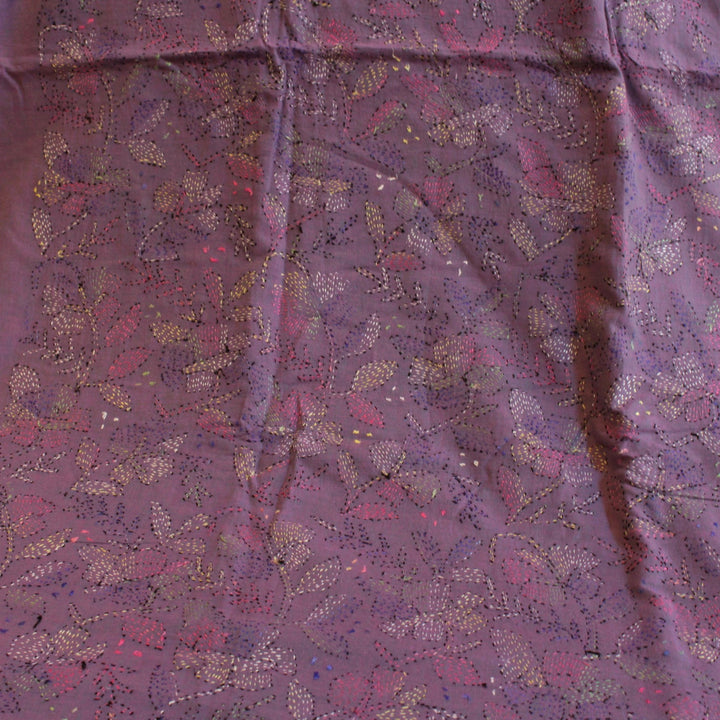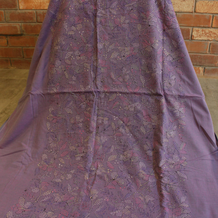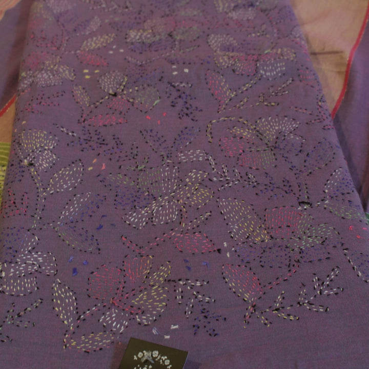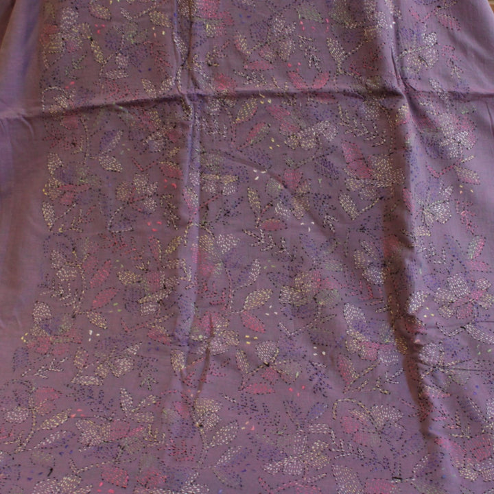 The hand embroidery features intricate kantha-kari detailing with multicolored threads, with the dupatta and sleeves adorned in motifs. The back is kept plain for a balanced look. It is recommended to stitch in a loose fit to prevent fabric rips. The fabric is soft, pure cotton, and should be hand washed with a mild detergent. Slight variations in color and design may occur, making each piece unique.