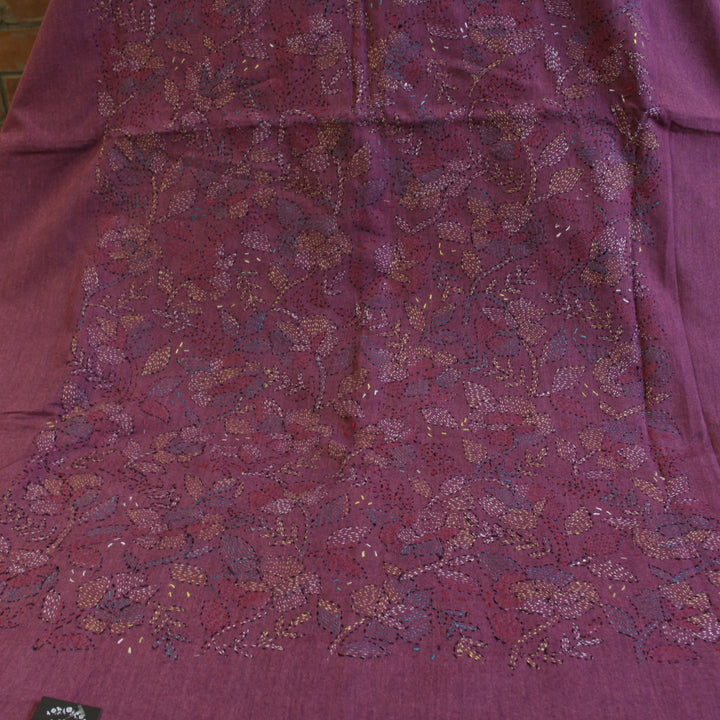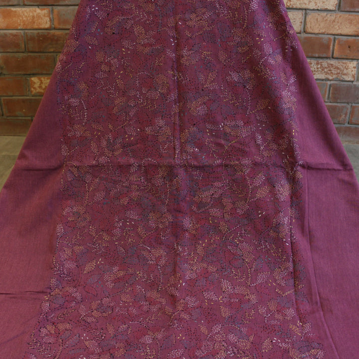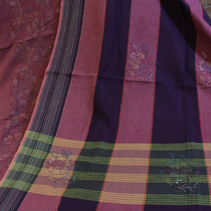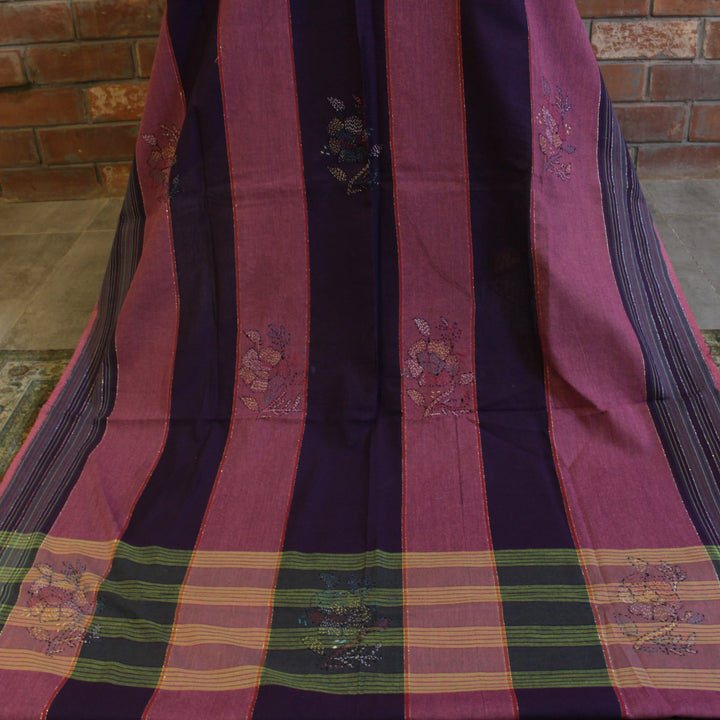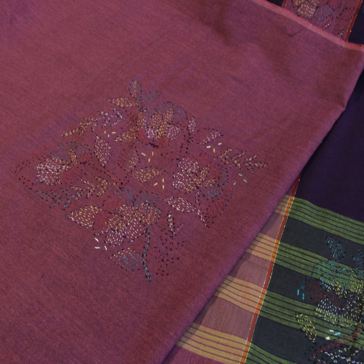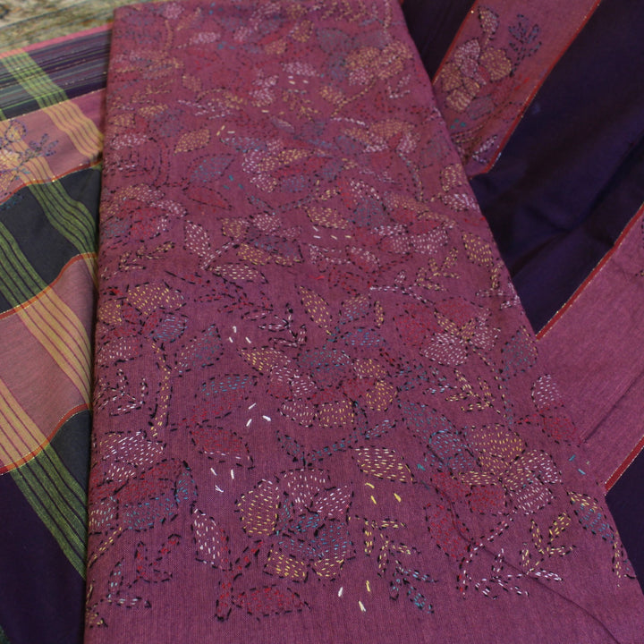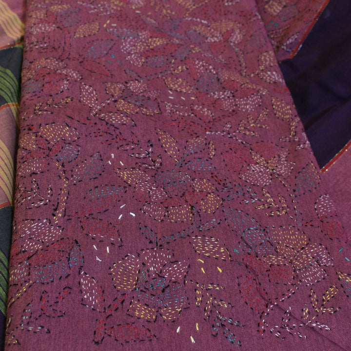 The hand embroidery features intricate kantha-kari detailing with multicolored threads, with the dupatta and sleeves adorned in motifs. The back is kept plain for a balanced look. It is recommended to stitch in a loose fit to prevent fabric rips. The fabric is soft, pure cotton, and should be hand washed with a mild detergent. Slight variations in color and design may occur, making each piece unique.