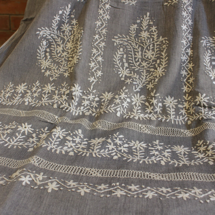 The hand embroidery features intricate mirror work and tarkashi detailing, with a beautifully bordered hem and sleeves adorned with motifs. The back is kept plain for a balanced look. It is recommended to stitch in a loose fit to prevent fabric rips. The fabric is soft, pure cotton, and should be hand washed with a light detergent. Slight variations in color and design may occur, making each piece unique.