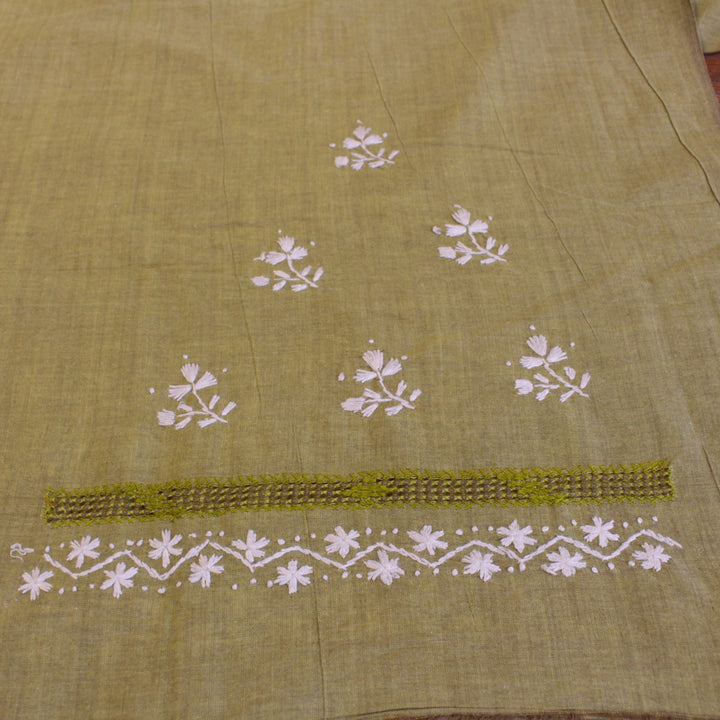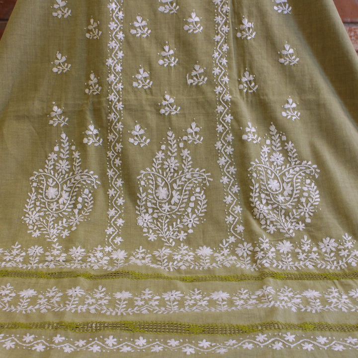 The hand embroidery features intricate mirror work and tarkashi detailing, with a beautifully bordered hem and sleeves adorned with motifs. The back is kept plain for a balanced look. It is recommended to stitch in a loose fit to prevent fabric rips. The fabric is soft, pure cotton, and should be hand washed with a light detergent. Slight variations in color and design may occur, making each piece unique.