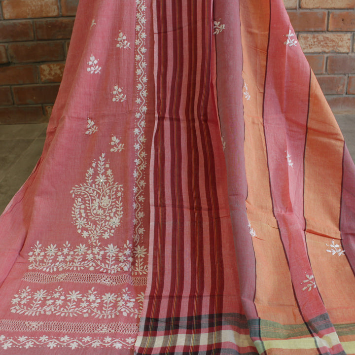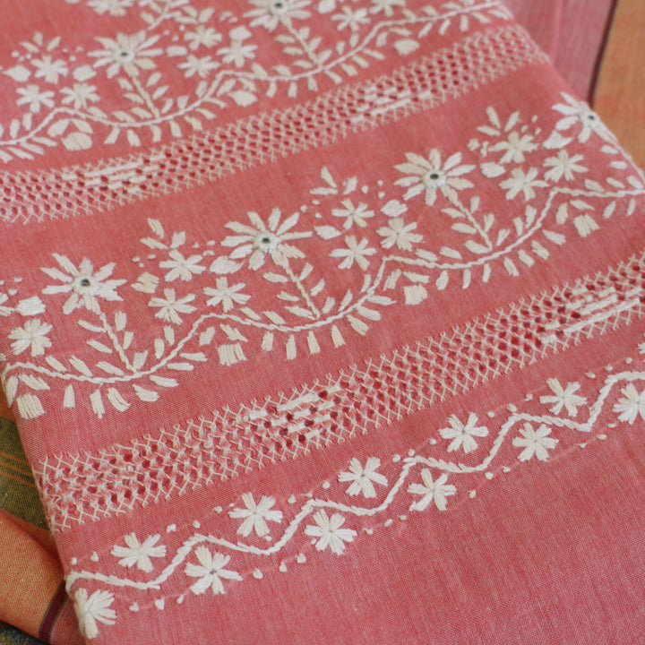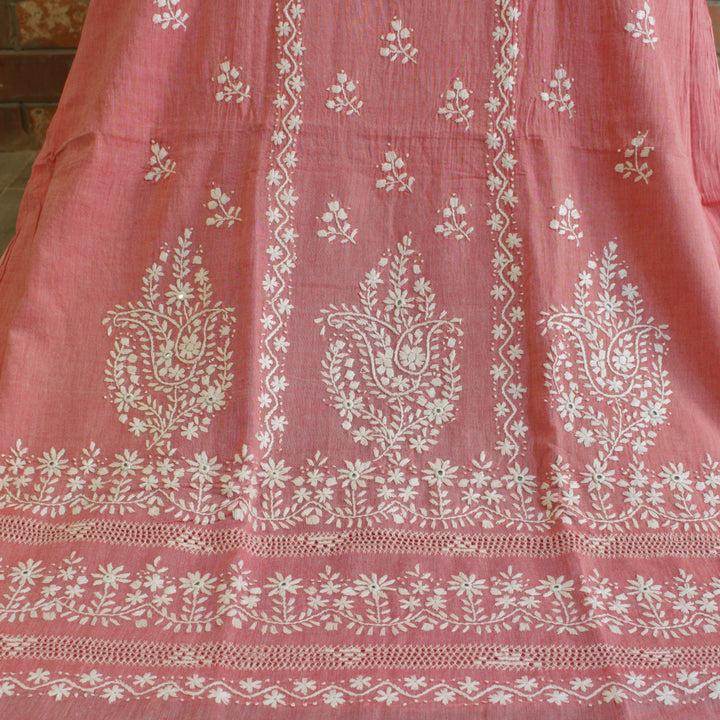 The hand embroidery features intricate mirror work and tarkashi detailing, with a beautifully bordered hem and sleeves adorned with motifs. The back is kept plain for a balanced look. It is recommended to stitch in a loose fit to prevent fabric rips. The fabric is soft, pure cotton, and should be hand washed with a light detergent. Slight variations in color and design may occur, making each piece unique.