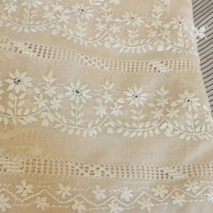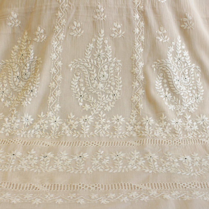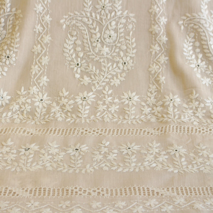The hand embroidery features intricate mirror work and tarkashi detailing, with a beautifully bordered hem and sleeves adorned with motifs. The back is kept plain for a balanced look. It is recommended to stitch in a loose fit to prevent fabric rips. The fabric is soft, pure cotton, and should be hand washed with a light detergent. Slight variations in color and design may occur, making each piece unique.