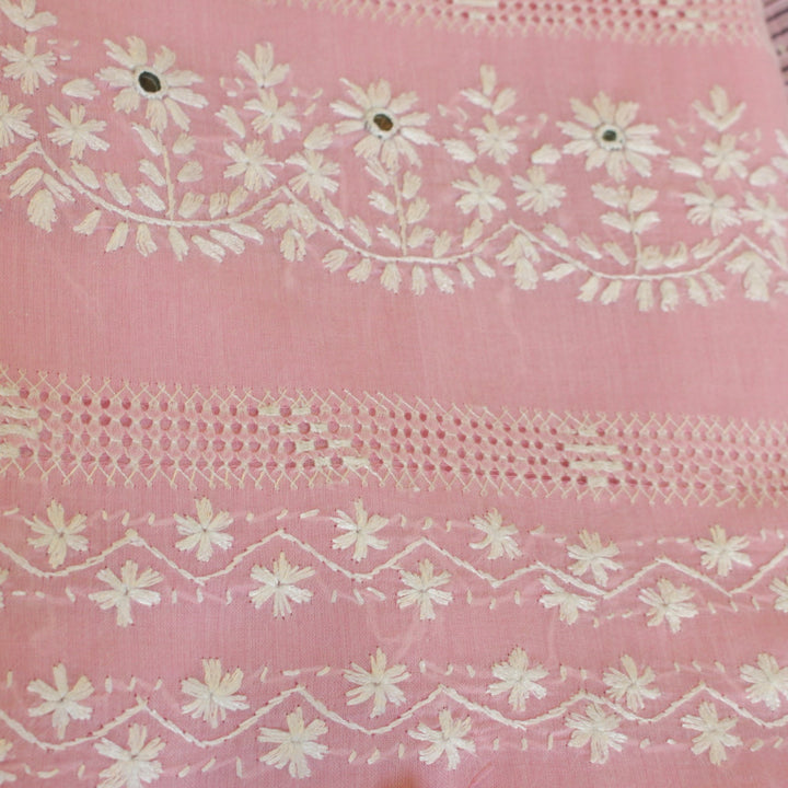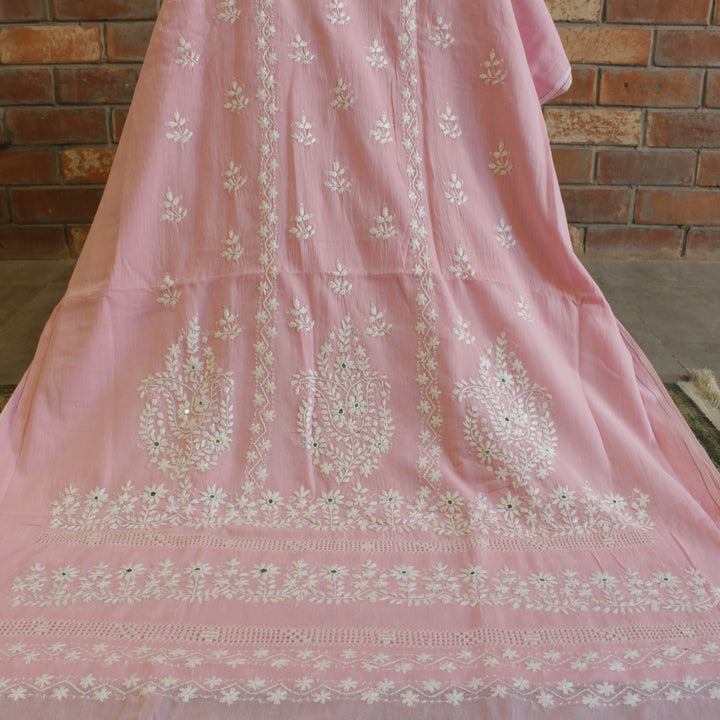 The hand embroidery features intricate mirror work and tarkashi detailing, with a beautifully bordered hem and sleeves adorned with motifs. The back is kept plain for a balanced look. It is recommended to stitch in a loose fit to prevent fabric rips. The fabric is soft, pure cotton, and should be hand washed with a light detergent. Slight variations in color and design may occur, making each piece unique.