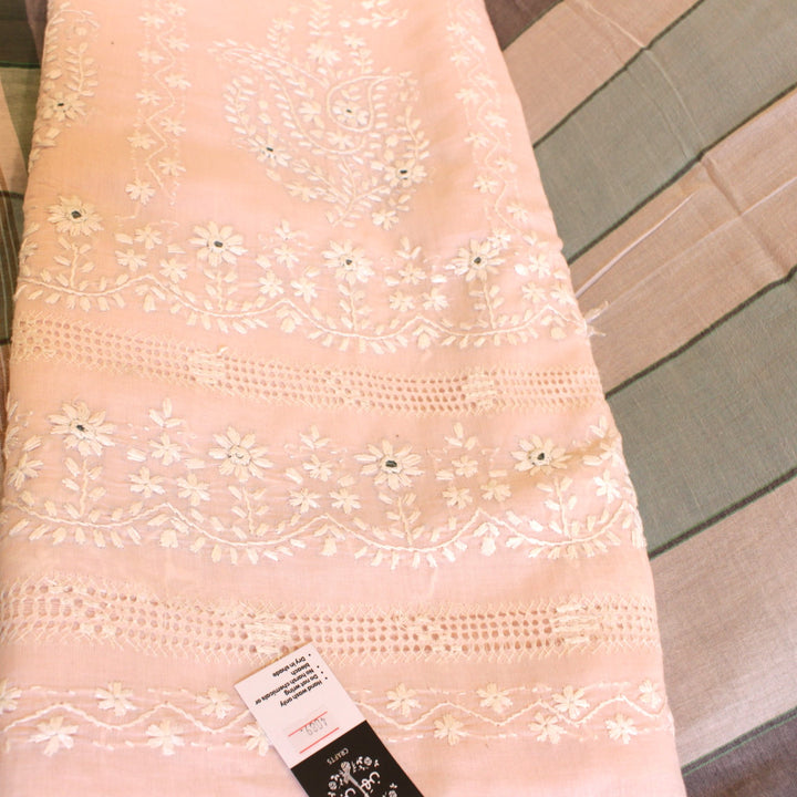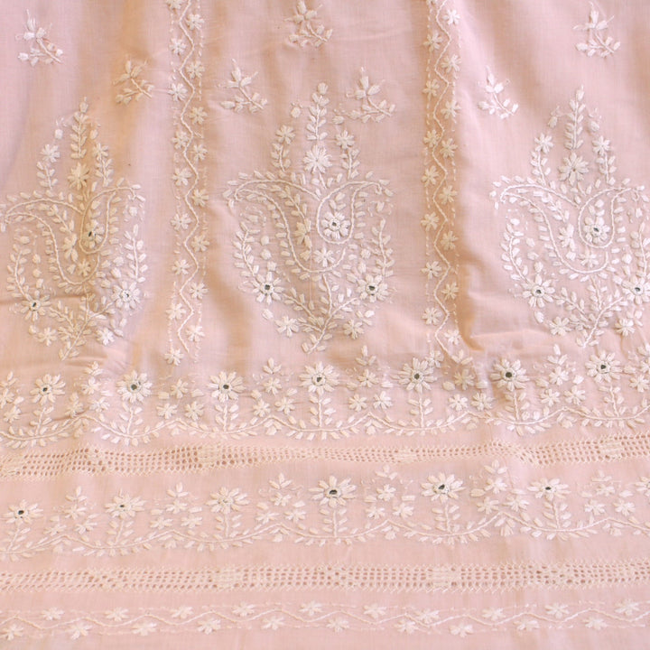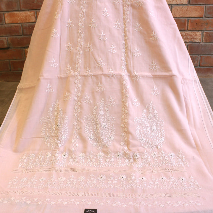 The hand embroidery features intricate mirror work and tarkashi detailing, with a beautifully bordered hem and sleeves adorned with motifs. The back is kept plain for a balanced look. It is recommended to stitch in a loose fit to prevent fabric rips. The fabric is soft, pure cotton, and should be hand washed with a light detergent. Slight variations in color and design may occur, making each piece unique.