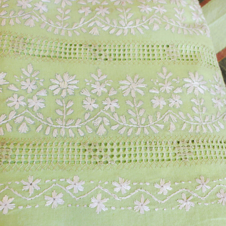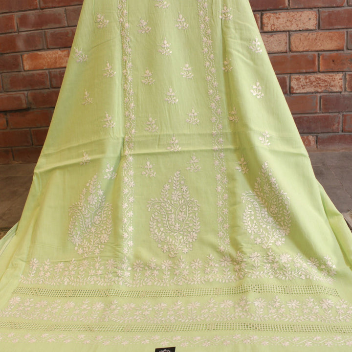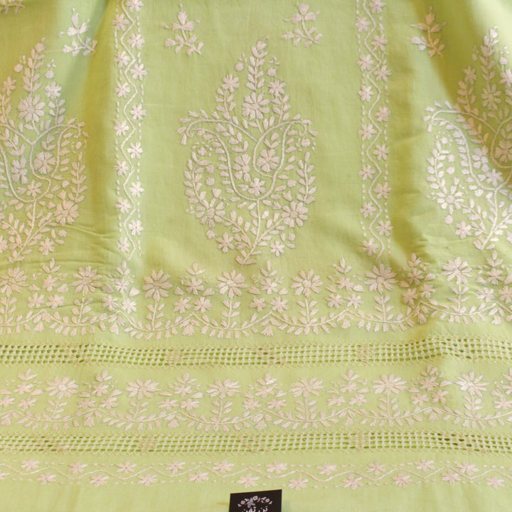 The hand embroidery features intricate mirror work and tarkashi detailing, with a beautifully bordered hem and sleeves adorned with motifs. The back is kept plain for a balanced look. It is recommended to stitch in a loose fit to prevent fabric rips. The fabric is soft, pure cotton, and should be hand washed with a light detergent. Slight variations in color and design may occur, making each piece unique.