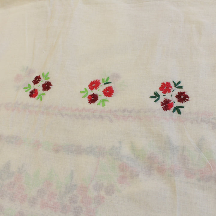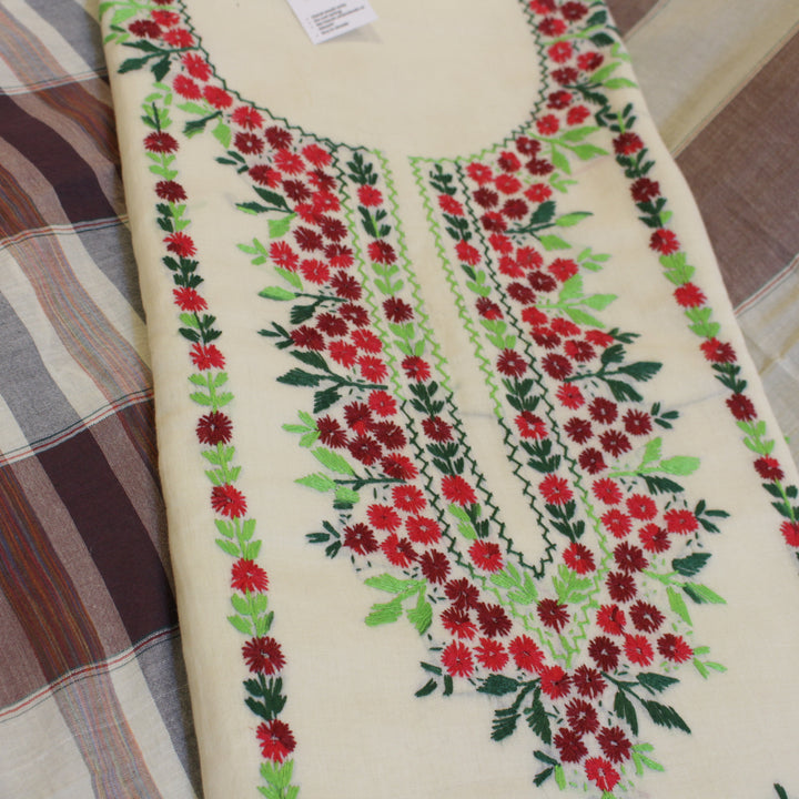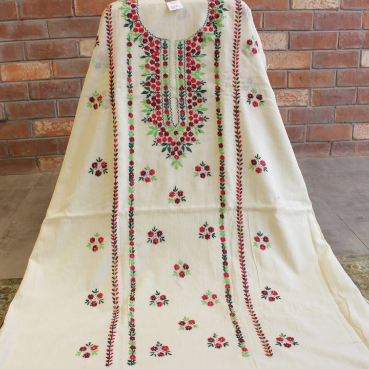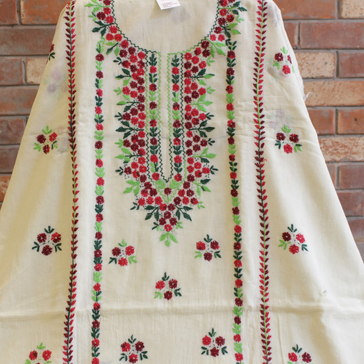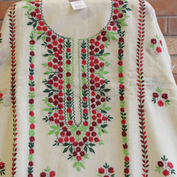 This hand-embroidered piece showcases vibrant, multi-colored detailing on the shirt, with intricate motifs adorning the sleeves. The back is left plain to create a balanced and elegant look. For durability and comfort, we recommend stitching it in a loose fit to prevent fabric stress. Crafted from soft, pure cotton, it requires gentle care—hand wash with mild detergent only. Please note, slight variations in color and design add to its uniqueness, ensuring every piece is one of a kind.