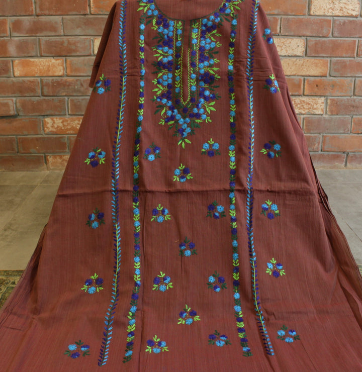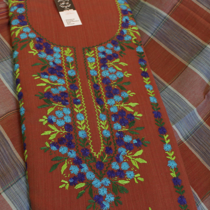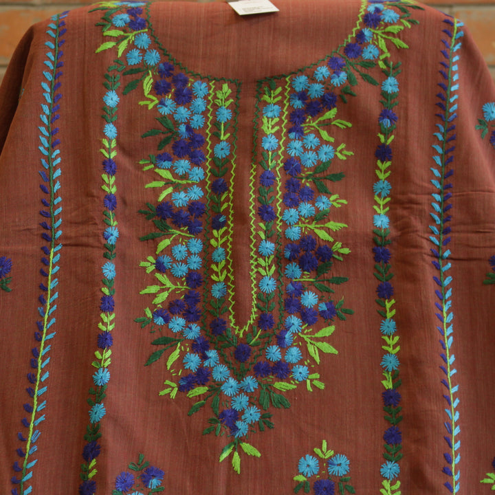 This hand-embroidered piece showcases vibrant, multi-colored detailing on the shirt, with intricate motifs adorning the sleeves. The back is left plain to create a balanced and elegant look. For durability and comfort, we recommend stitching it in a loose fit to prevent fabric stress. Crafted from soft, pure cotton, it requires gentle care—hand wash with mild detergent only. Please note, slight variations in color and design add to its uniqueness, ensuring every piece is one of a kind.
