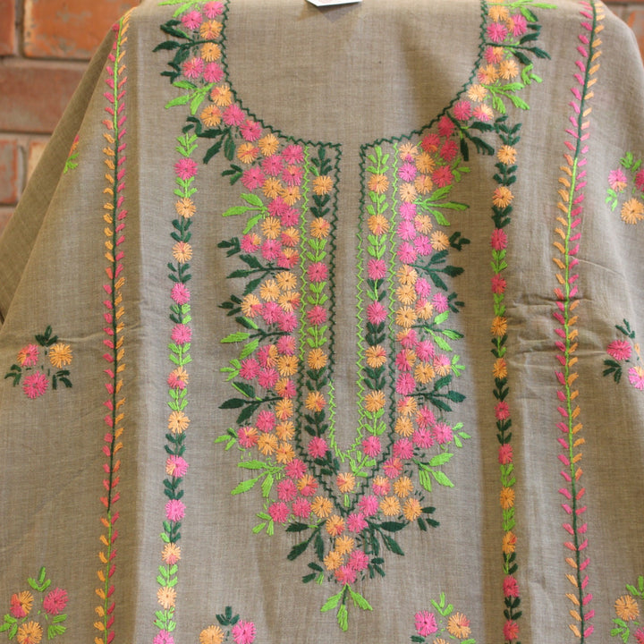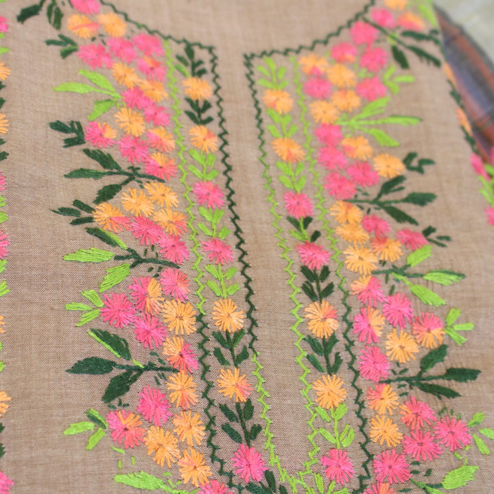 This hand-embroidered piece showcases vibrant, multi-colored detailing on the shirt, with intricate motifs adorning the sleeves. The back is left plain to create a balanced and elegant look. For durability and comfort, we recommend stitching it in a loose fit to prevent fabric stress. Crafted from soft, pure cotton, it requires gentle care—hand wash with mild detergent only. Please note, slight variations in color and design add to its uniqueness, ensuring every piece is one of a kind.