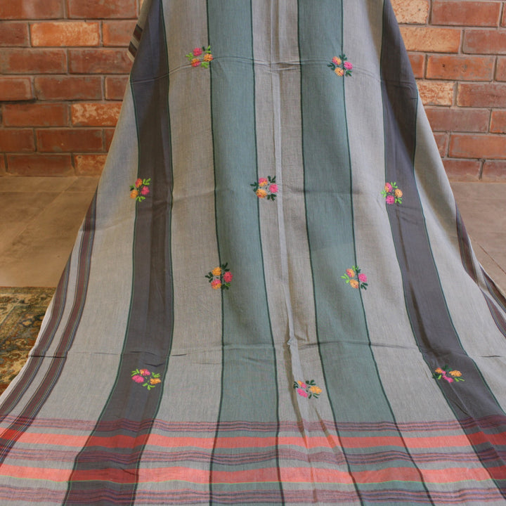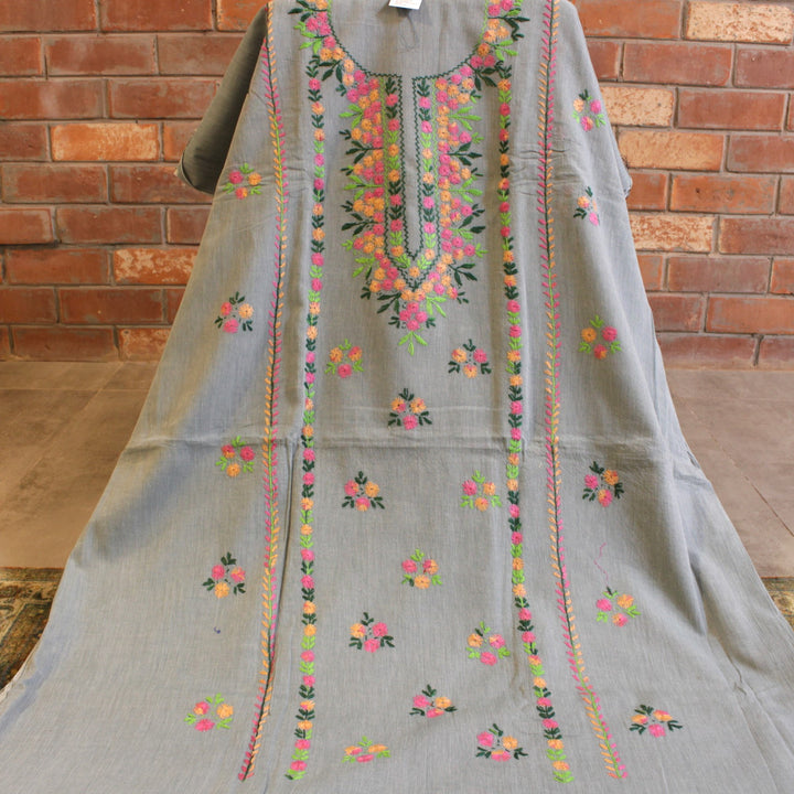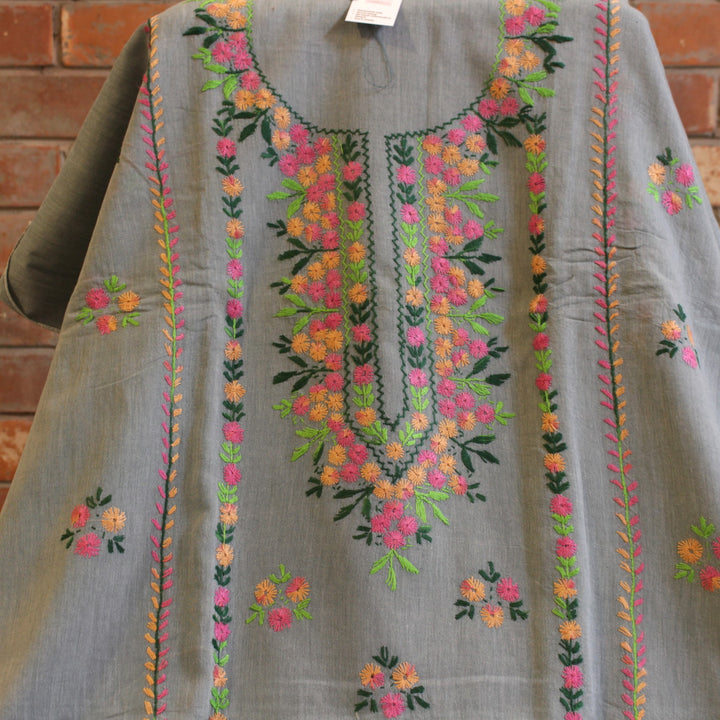 This hand-embroidered piece showcases vibrant, multi-colored detailing on the shirt, with intricate motifs adorning the sleeves. The back is left plain to create a balanced and elegant look. For durability and comfort, we recommend stitching it in a loose fit to prevent fabric stress. Crafted from soft, pure cotton, it requires gentle care—hand wash with mild detergent only. Please note, slight variations in color and design add to its uniqueness, ensuring every piece is one of a kind.
