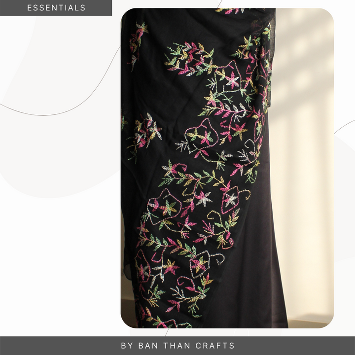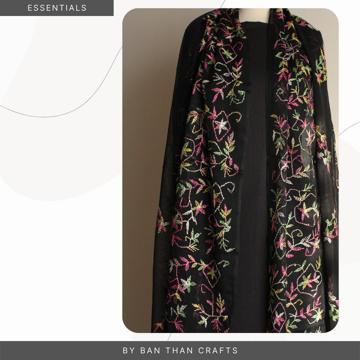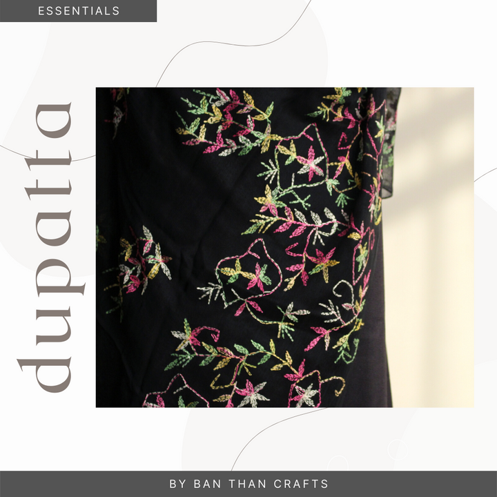 No wardrobe is complete without a black dupatta/scarf/stole. This black dupatta is fit for all-day wear. Multi-color embroidery is a perfect pick that would spice up all outfits.