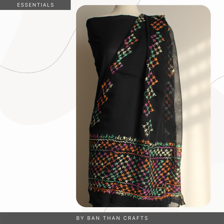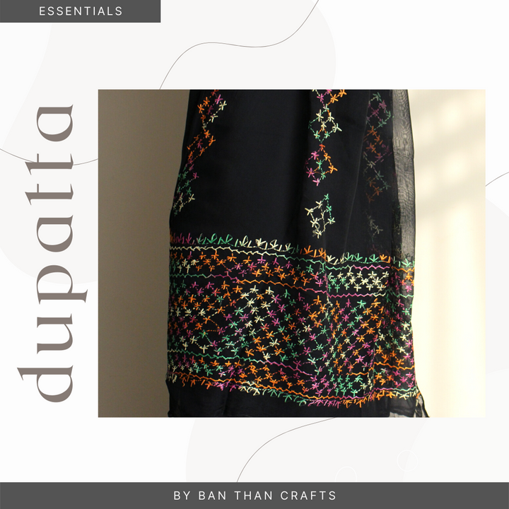 No wardrobe is complete without a black dupatta/scarf/stole. This black dupatta is fit for all-day wear. Multi-color embroidery is a perfect pick that would spice up all outfits.