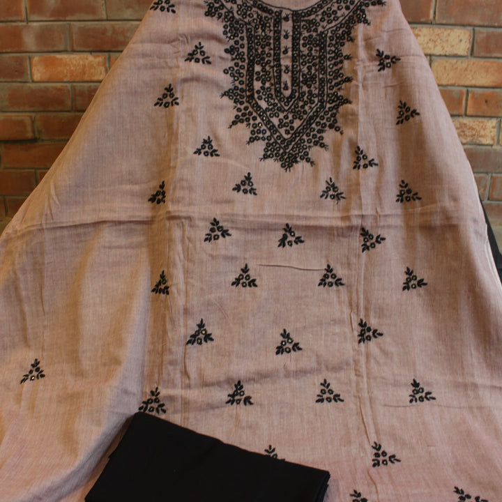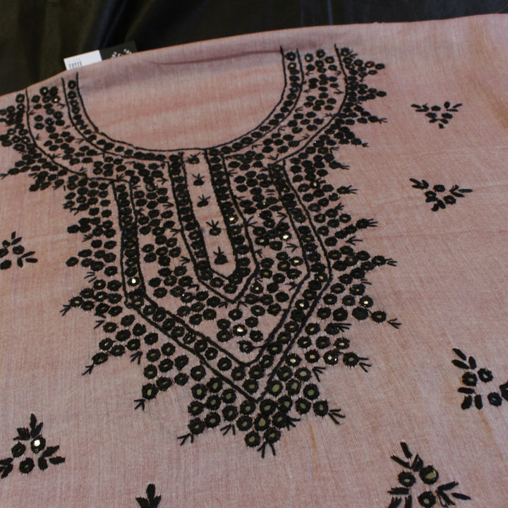 Crafted from pure cotton handloom fabric, this kurta features hand embroidery on the front, decorative sleeve motifs, and a plain back.