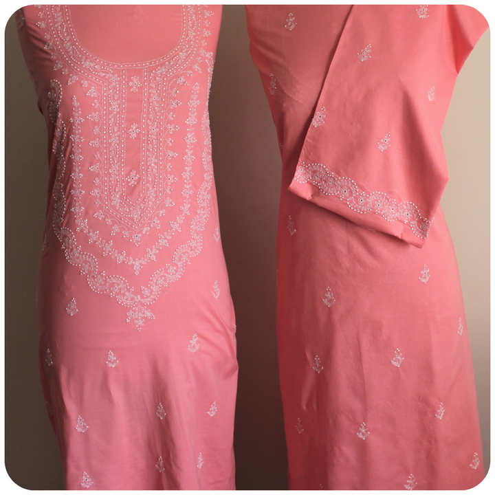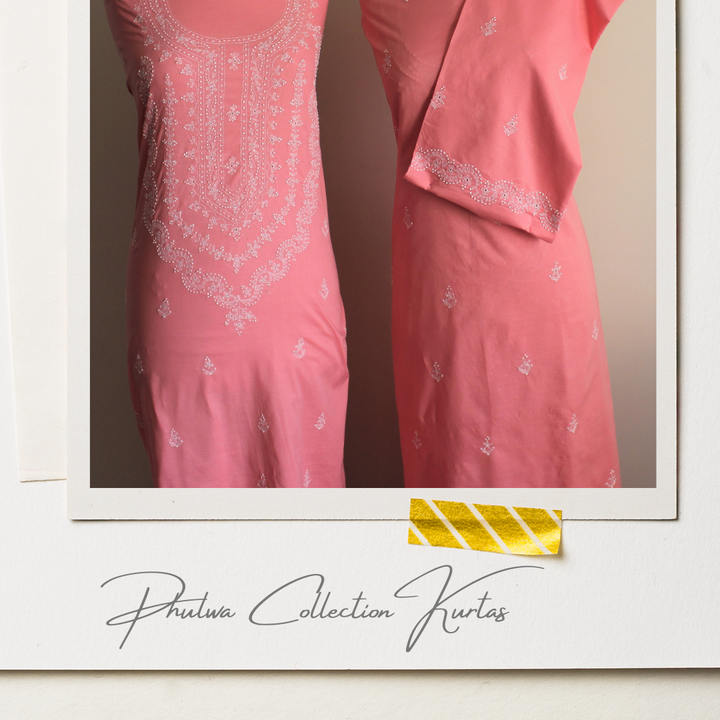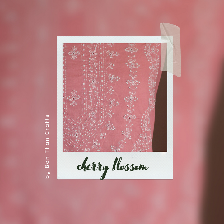 A statement piece in rose pink color with a hint of peach, representing the sweetness of cherry blossom season. ‘Cherry Blossom’ kurta is hand-embroidered with white cotton thread, with the most delicate details & intricate work.