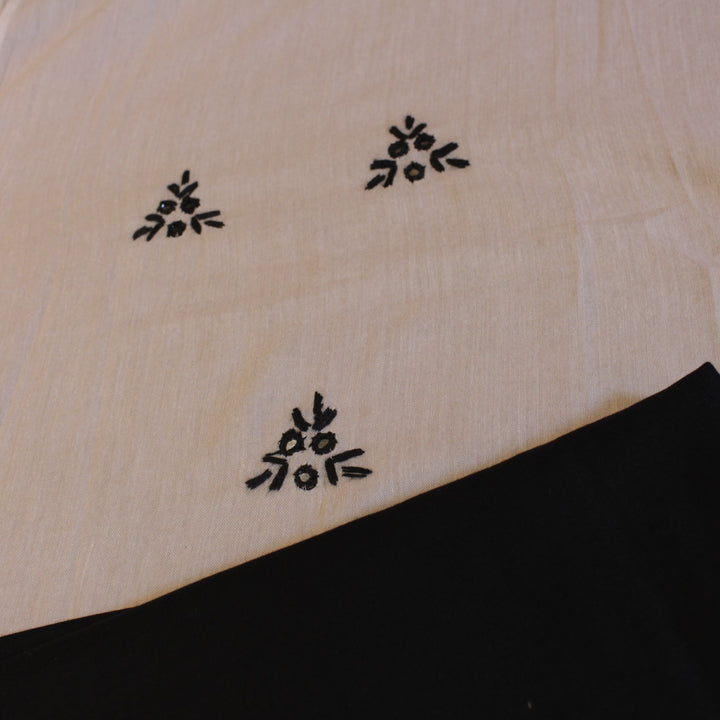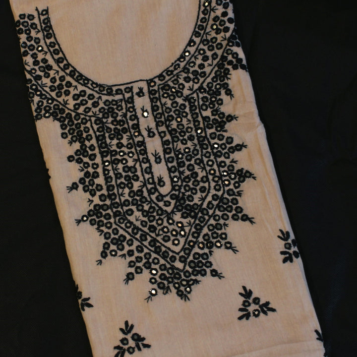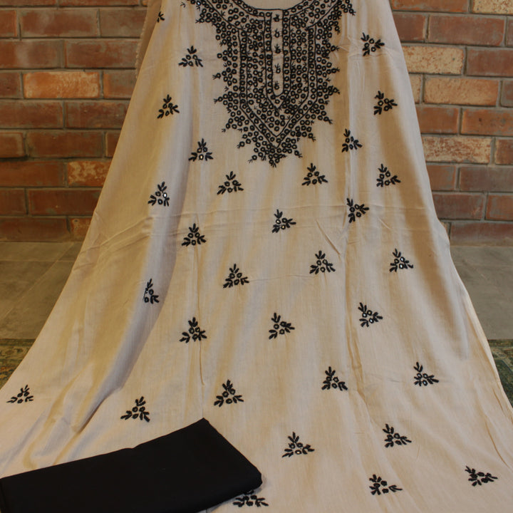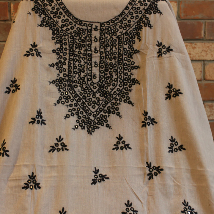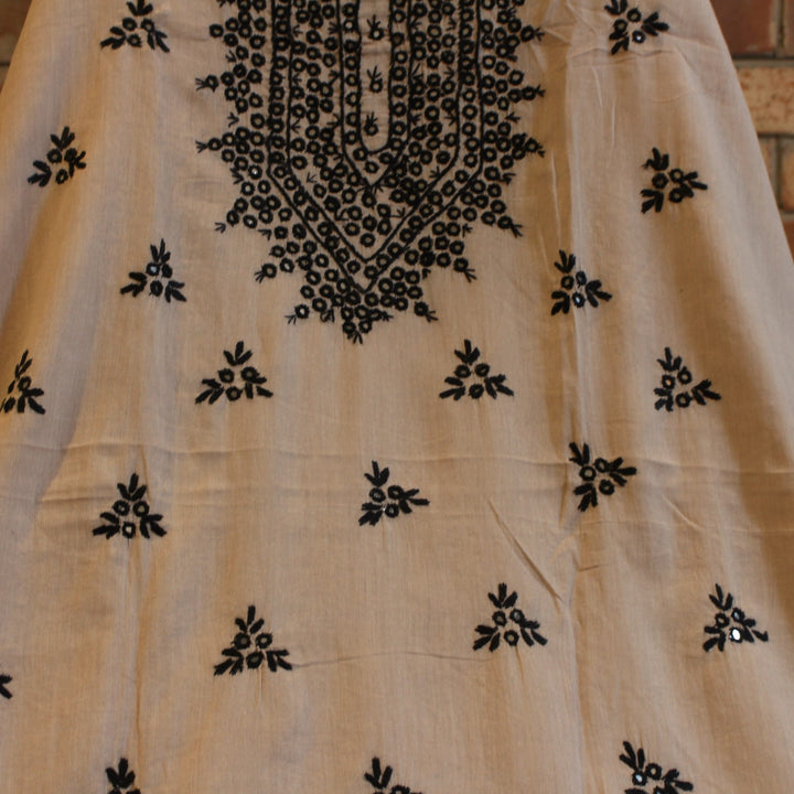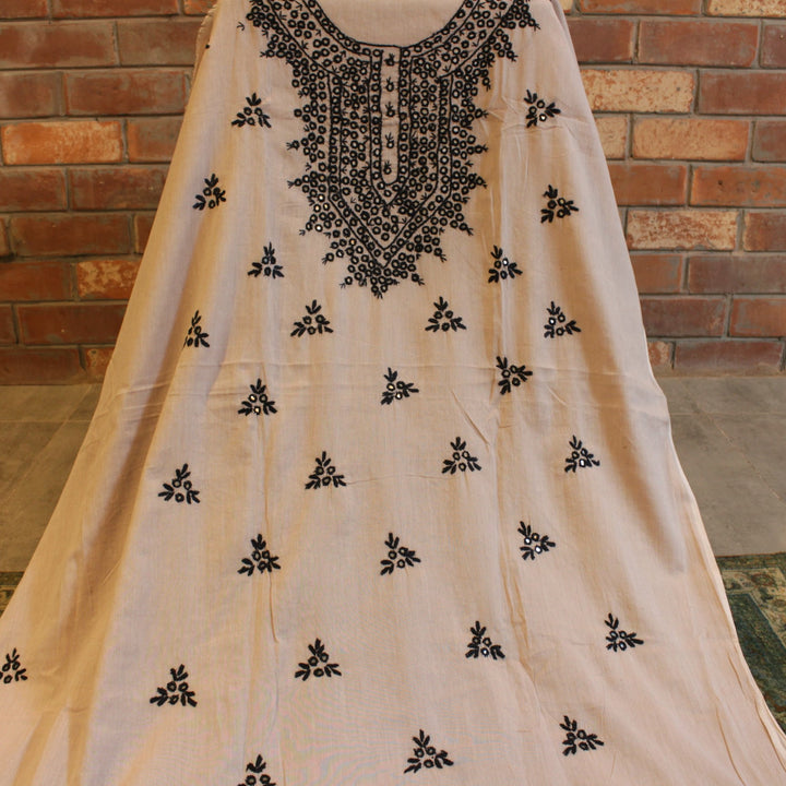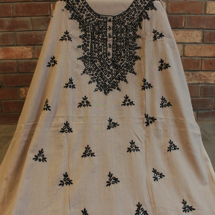 Crafted from pure cotton handloom fabric, this kurta features hand embroidery on the front, decorative sleeve motifs, and a plain back.