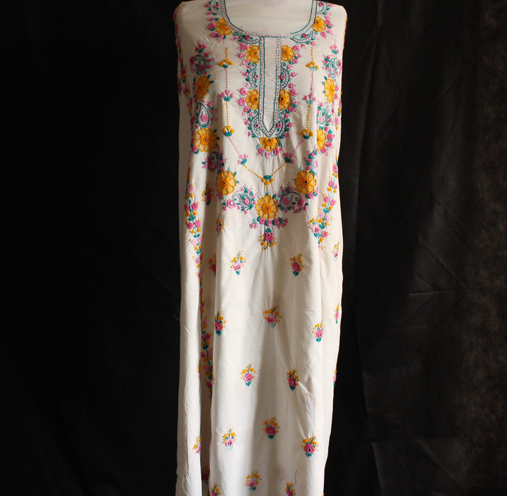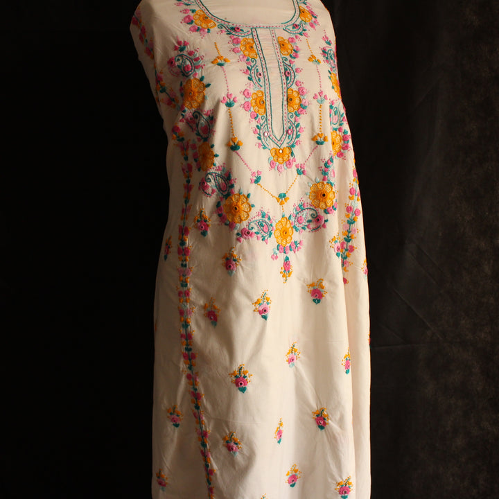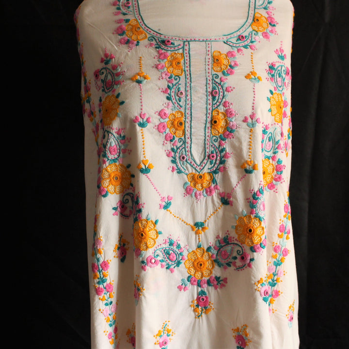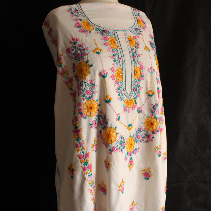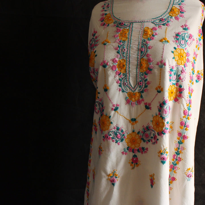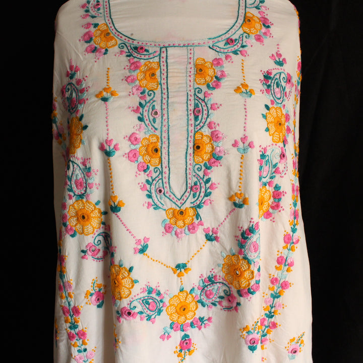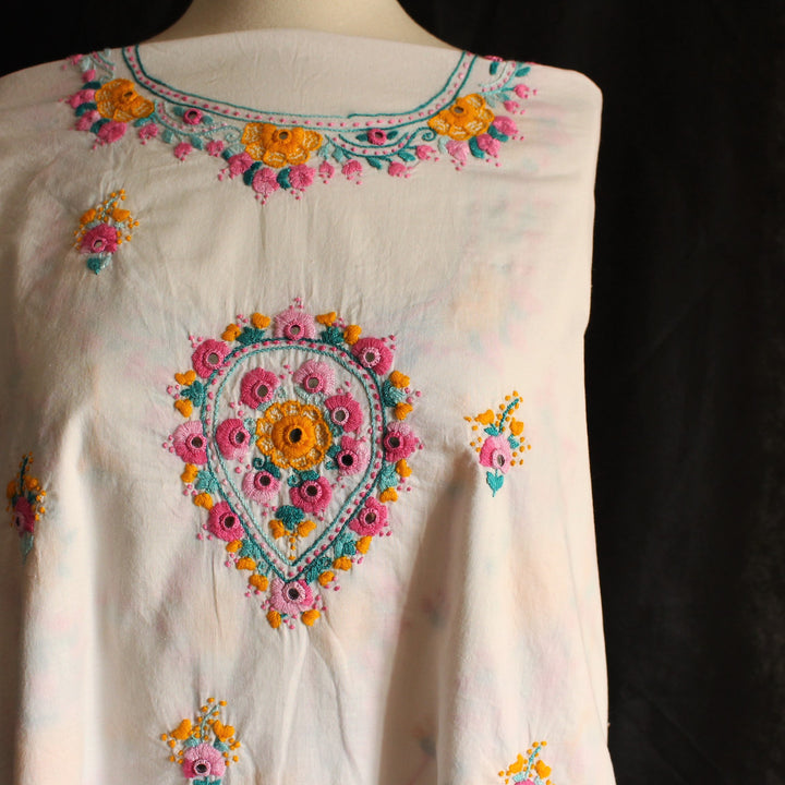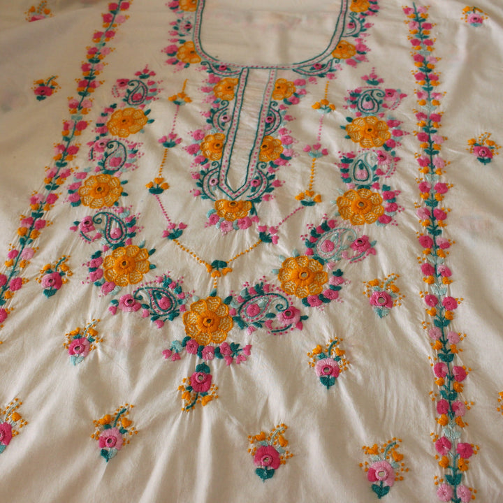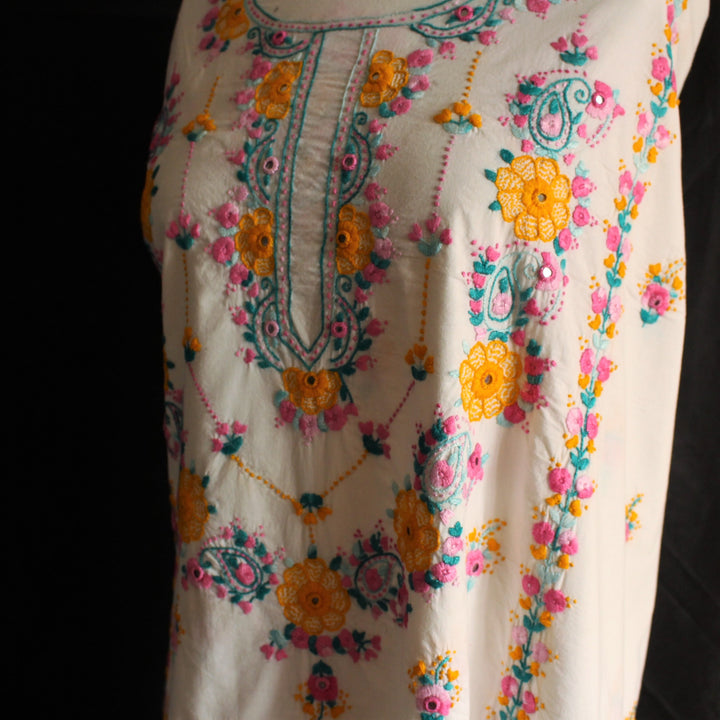 A statement piece in pearl white color! ‘Promise Me’ kurta is hand-embroidered with pink & marigold cotton thread & mirror-work, with the most delicate details & intricate work.