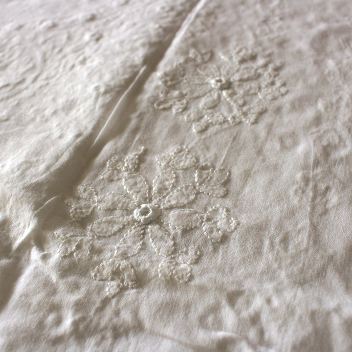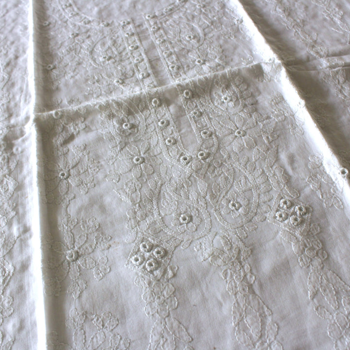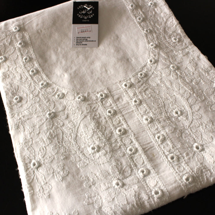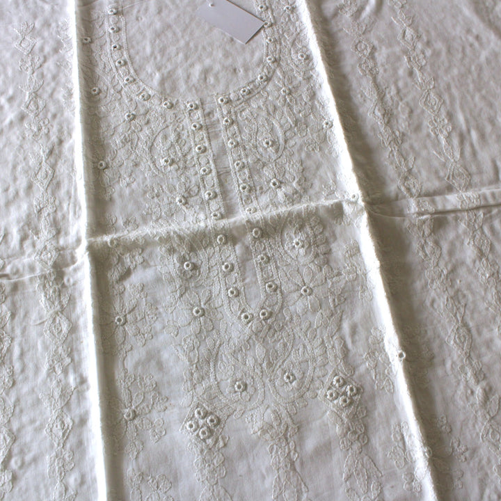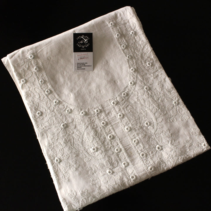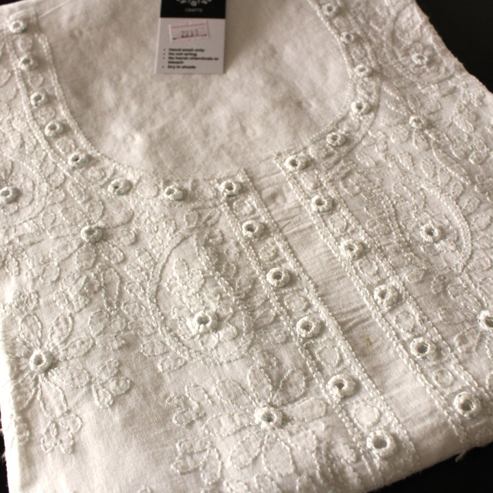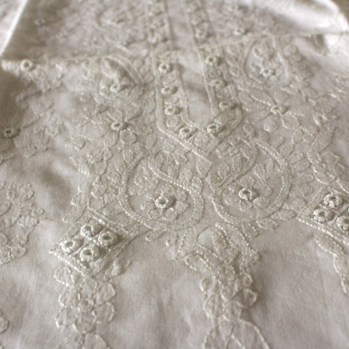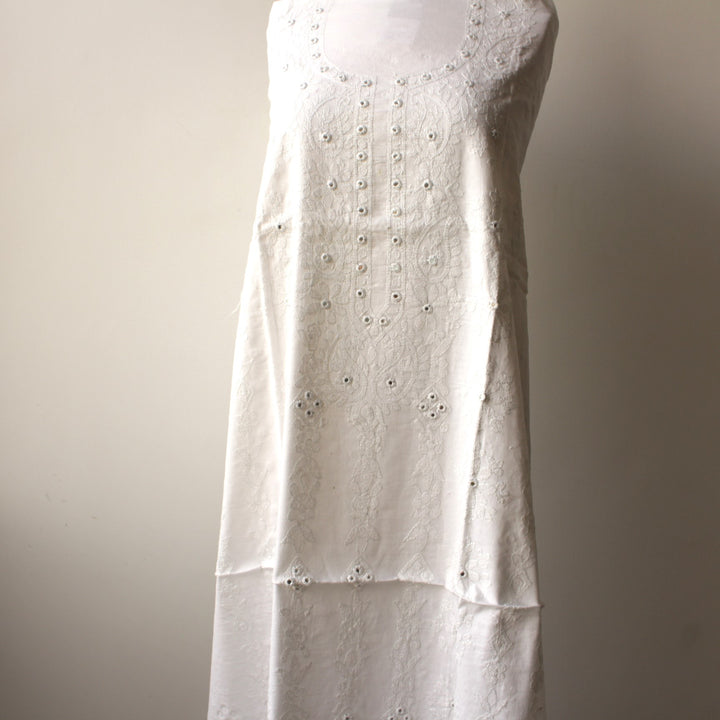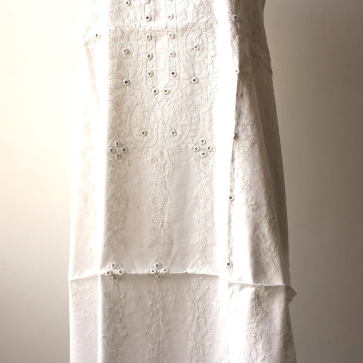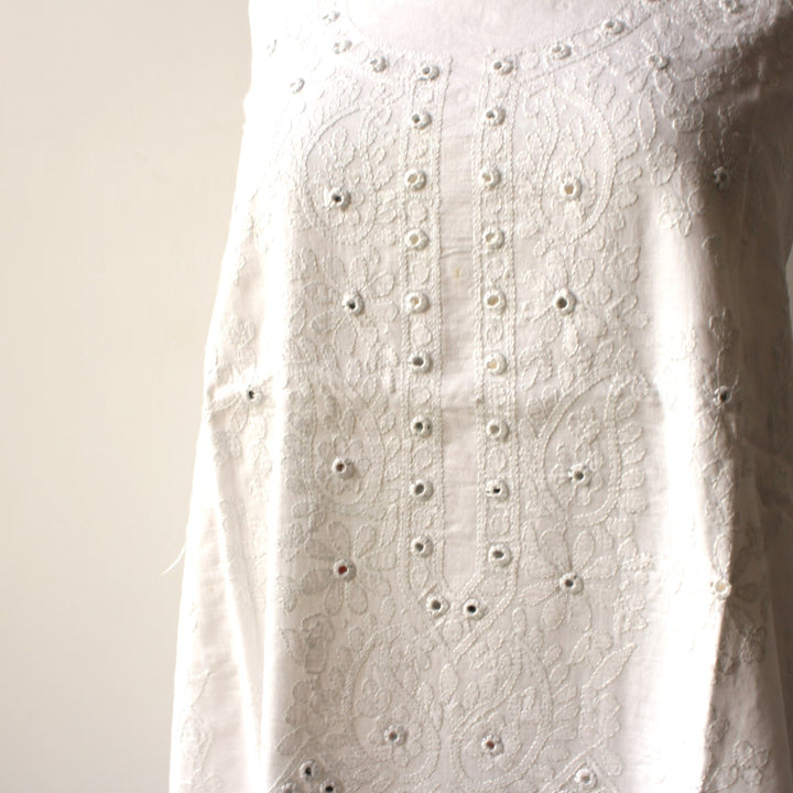 This white lawn kurta features intricate hand embroidery with white thread and mirror-work.